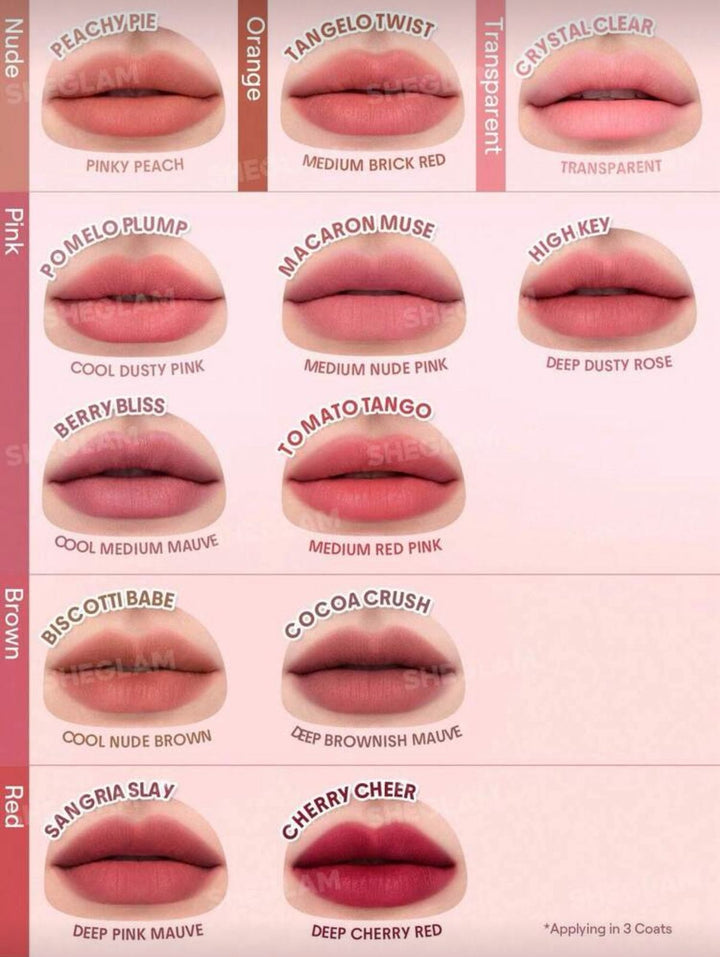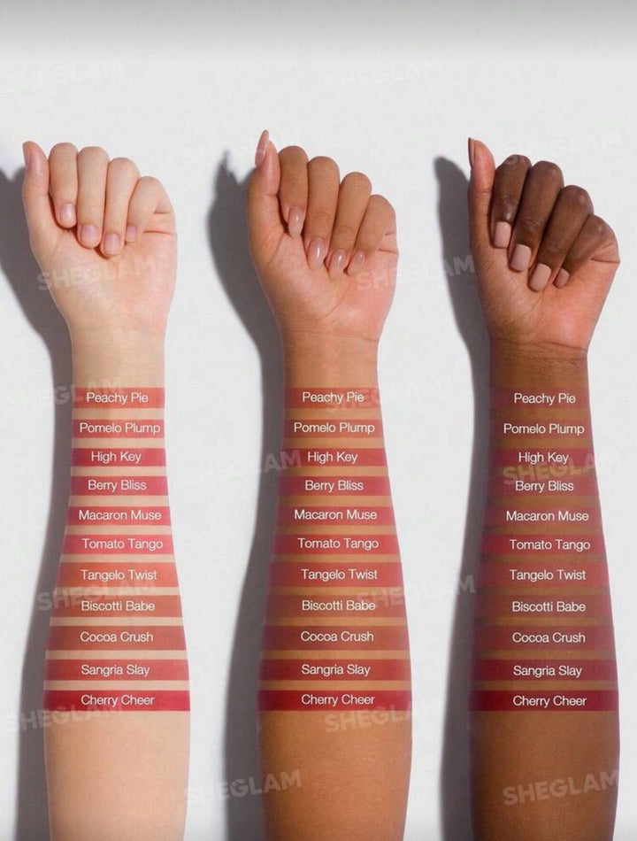 High Key, Biscotti Babe, Pomelo Plump, Berry Bliss, Cocoa Crush, Cherry Cheer, Peachy Pie, Sangria Slay, Macaron Muse, Tangelo Twist, Crystal Clear, Tomato Tango |