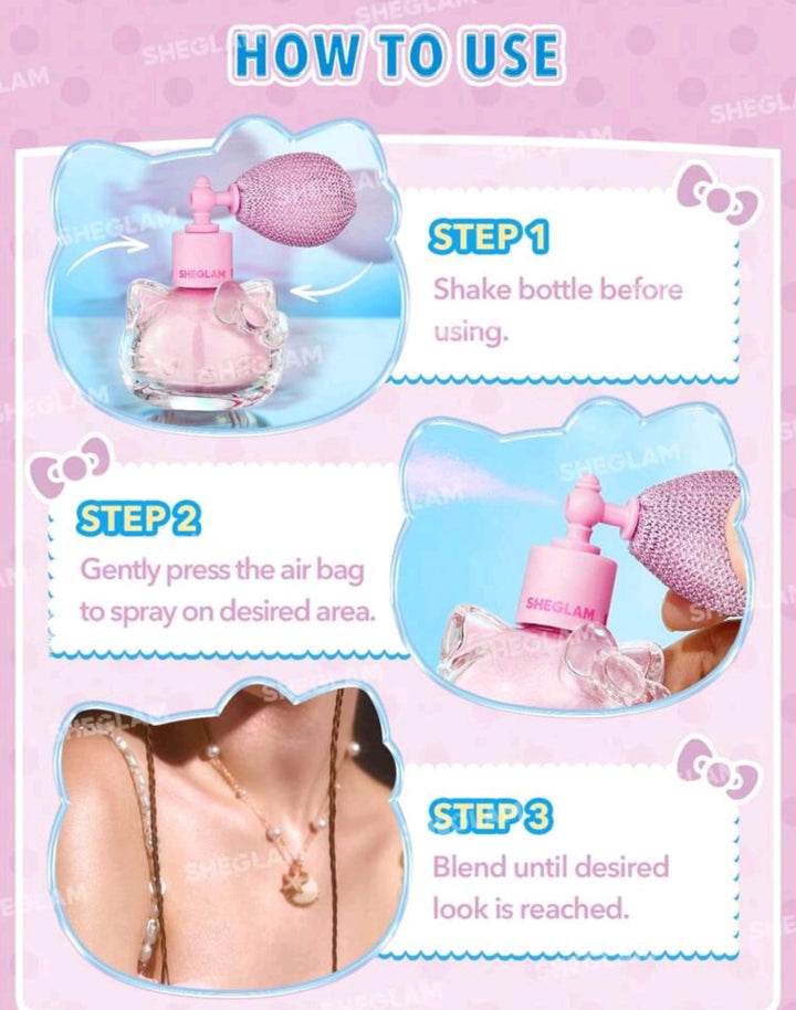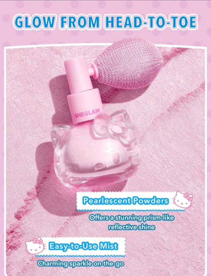 Enhance your radiance with Hello Kitty|SHEGLAM Bow-Utiful Highlighting Body Mist-Kitty Glow. This shimmering mist features a delicate bow design, leaving a subtle and luminous glow on skin. The perfect accessory for any occasion, indulge in a luminous, picture-perfect look.